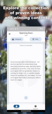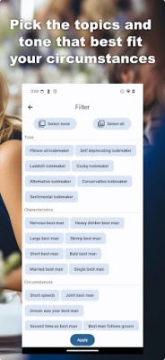 Unveil a wealth of inspiration for your best man speech with the Wedding Speech Builder app. Effortlessly navigate through a plethora of topics and tones to unearth the perfect blend of humorous roasts, insightful observations, charming tributes, and sincere toasts. Save your favourite content to customize and refine at your leisure. Utilize our advanced filters to tailor your speech precisely to your event, ensuring it resonates with your audience. Seamlessly integrate your own ideas, and let our AI craft a bespoke speech tailored precisely to your preferences. Crafting an unforgettable best man speech has never been easier. Download the Wedding Speech Builder app today and elevate your moment to perfection.