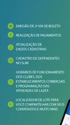Você terá acesso para atualizar seus dados cadastrais, consultar seus débitos, realizar seus pagamentos, conferir os horários de funcionamento dos clubes, dos estabelecimentos e das atividades de lazer dentro do loteamento, cadastrar seus dependentes para desfrutar dos clubes do SLIM, localizar seu lote e compartilhar essa localização com seus visitantes e muito mais.