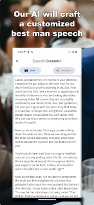 Unveil a wealth of inspiration for your best man speech with the Wedding Speech Builder app. Effortlessly navigate through a plethora of topics and tones to unearth the perfect blend of humorous roasts, insightful observations, charming tributes, and sincere toasts. Save your favourite content to customize and refine at your leisure. Utilize our advanced filters to tailor your speech precisely to your event, ensuring it resonates with your audience. Seamlessly integrate your own ideas, and let our AI craft a bespoke speech tailored precisely to your preferences. Crafting an unforgettable best man speech has never been easier. Download the Wedding Speech Builder app today and elevate your moment to perfection.